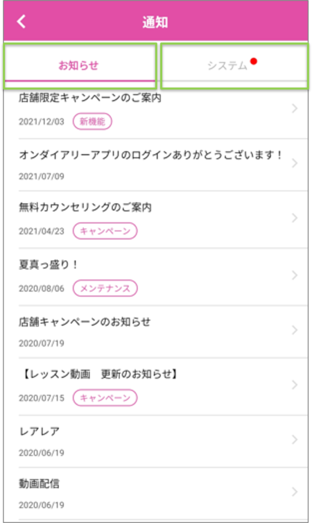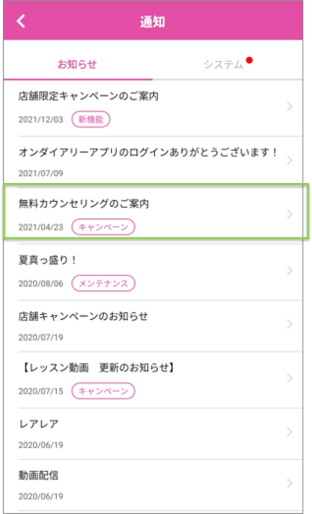 ②お知らせ一覧が日付が新しい順で表示される。上部の【お知らせ】または【システム】を押すと、それぞれのお知らせが表示される。