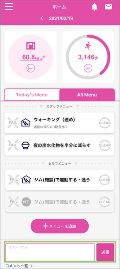 ※1日に複数回のコメントを送信する場合は前回のコメントに追記して入力します(前回入力したコメントはコメント欄に表示されます)
