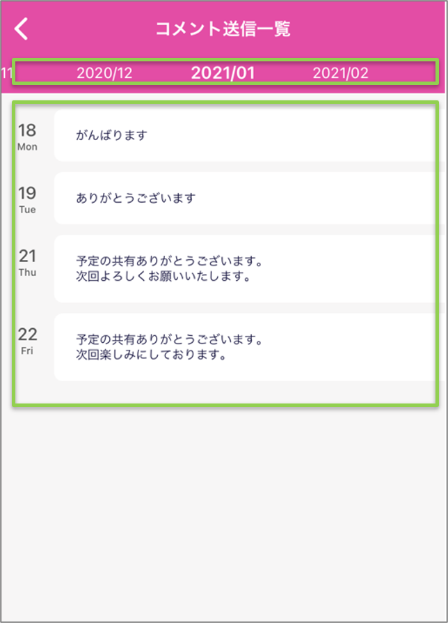 ※画面上にある年月を選ぶと、過去に送信したコメントが月毎に一覧で表示されます