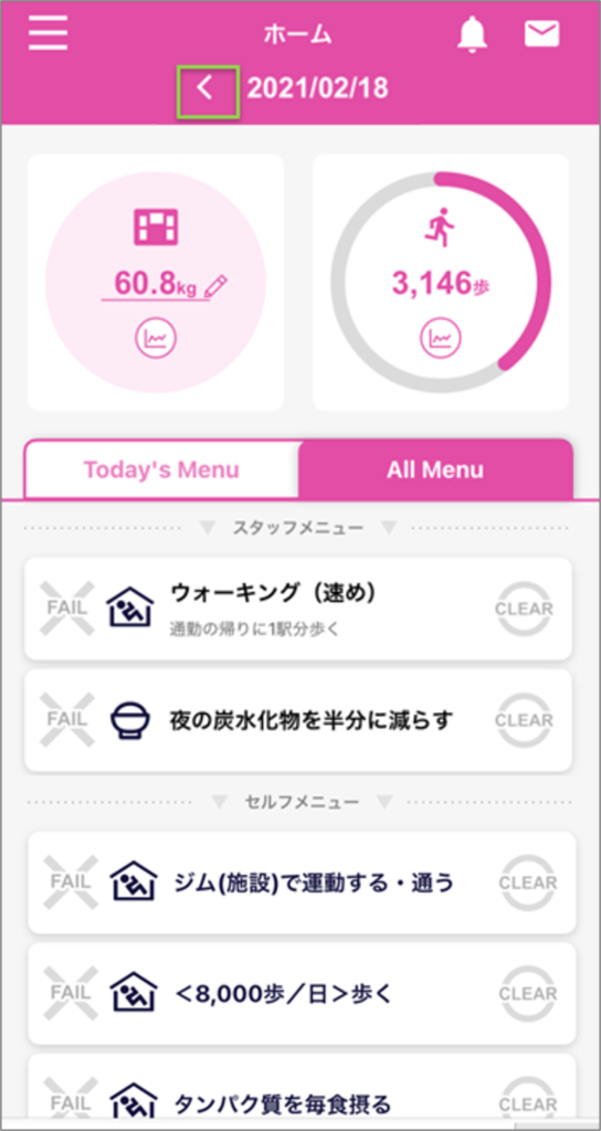 ホーム画面でメニューを終了した以前の日付に戻る。