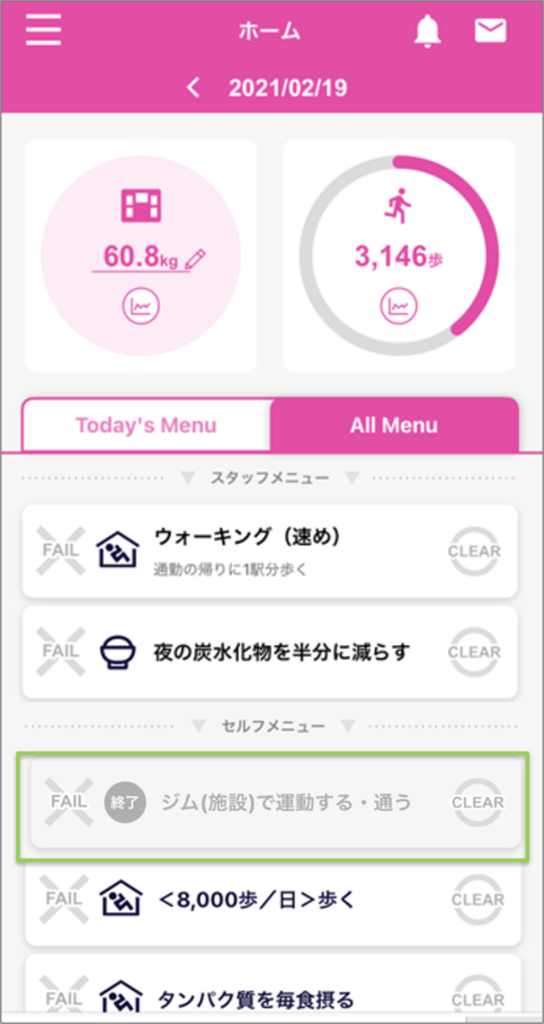 ※1度も実施記録をつけてない場合はメニューが削除されるので表示されません。