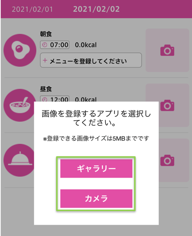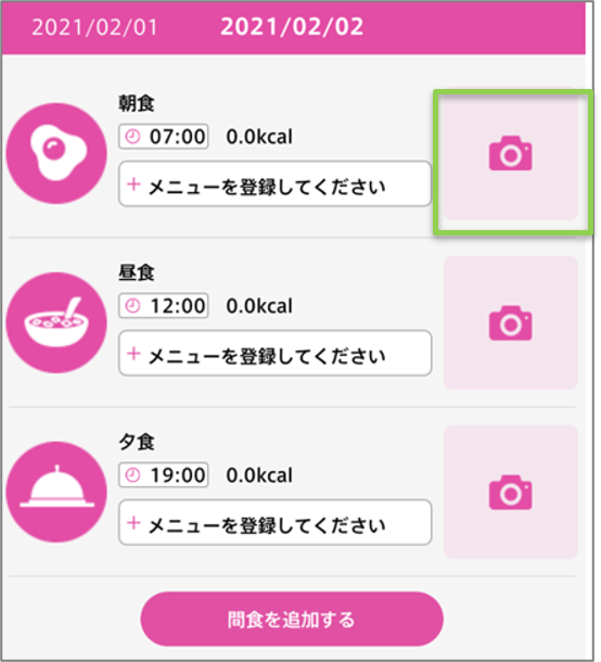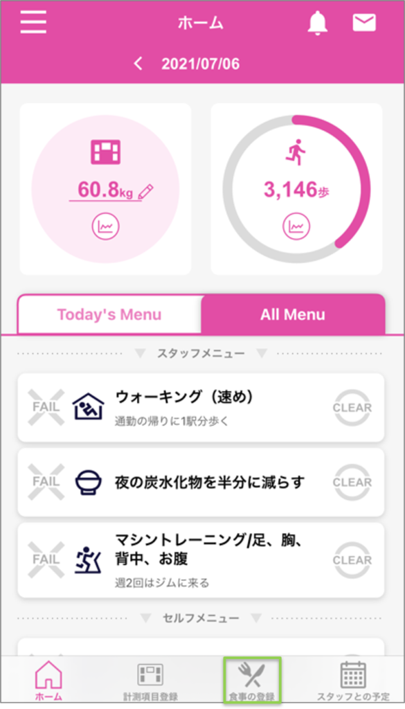①ホーム画面一番下の【食事の登録】を選ぶ