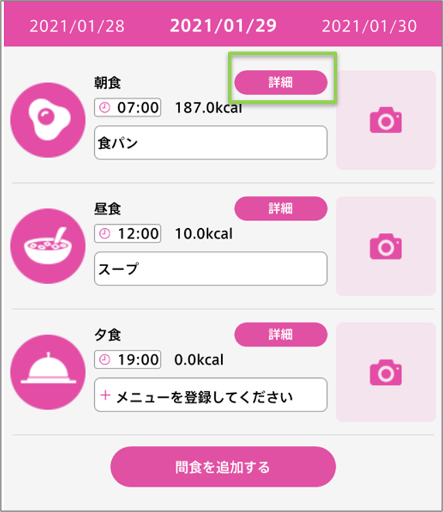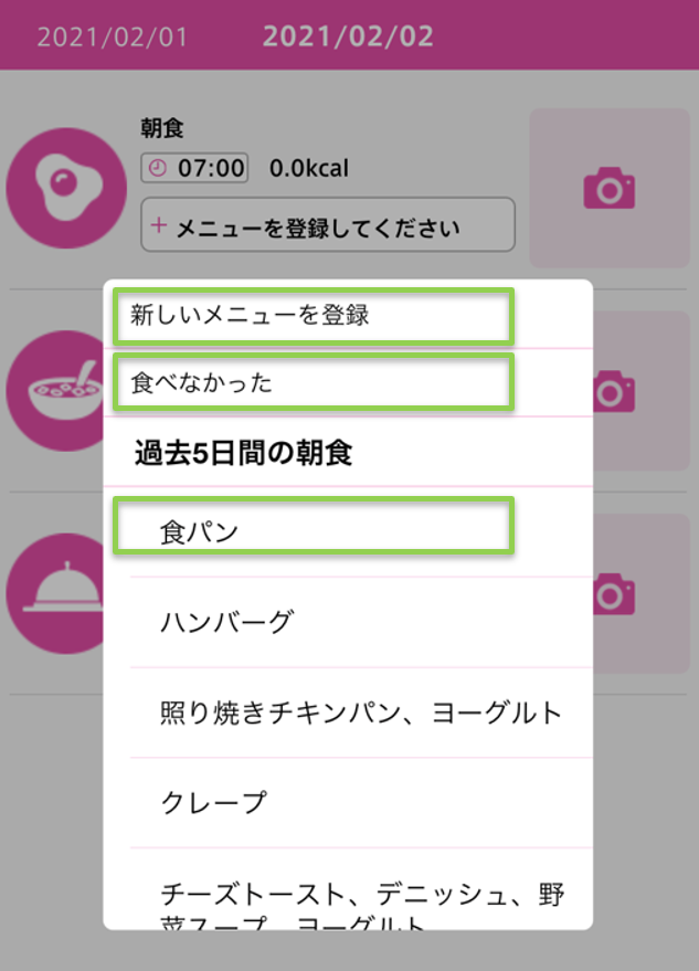 ③【新しいメニューを登録】または【食べなかった】または【過去5日間の食事】の中からメニューを選ぶ