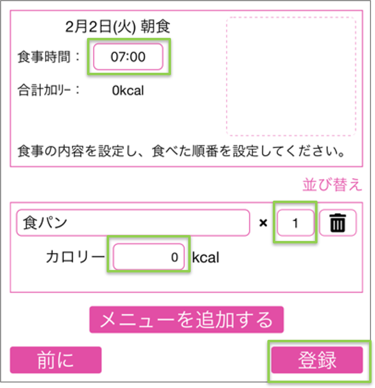 ⑥【食事時間】を入力→【数量】と【カロリー】(未入力の場合)を入力(複数のメニューがある場合は全メニュー分)→【登録】を押す
