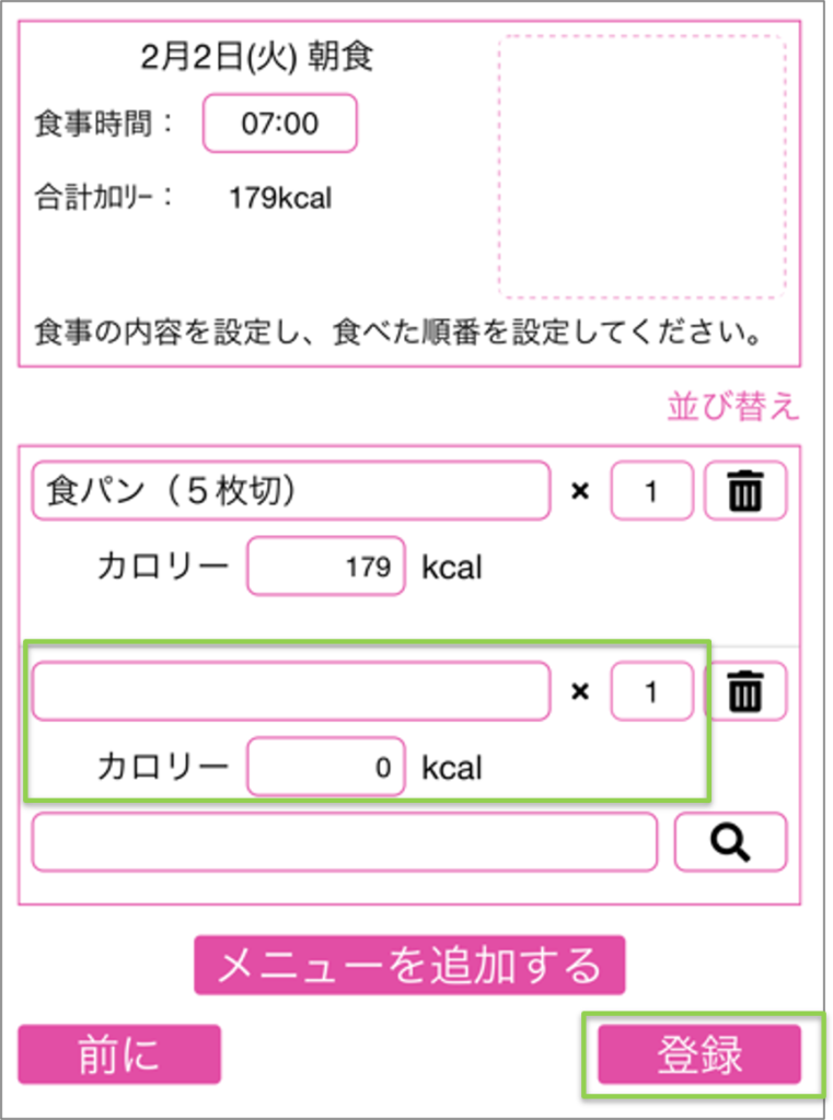 メニューを検索しない場合、【メニュー名】【カロリー】【数量】を入力→【登録】を押す