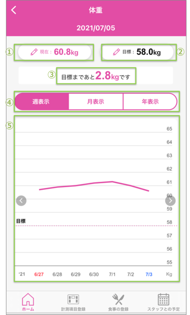 ⑤体重のグラフです。体重目標が設定されていると、グラフ上にピンクの点線で表示されます。
