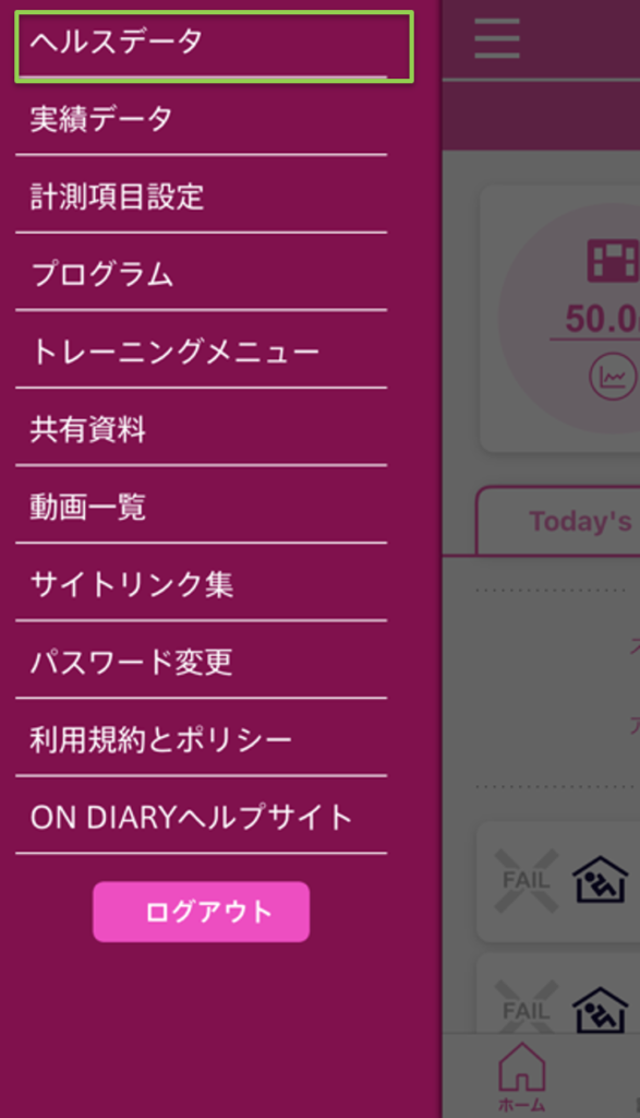 ※体重以外の測定項目をグラフで確認する場合は、サイドメニューの【実績データ】で確認できます。