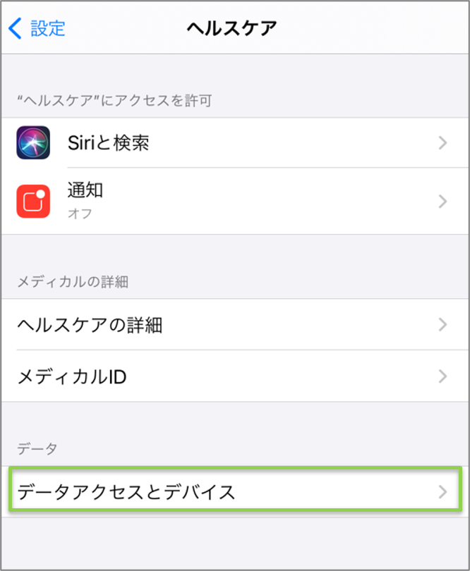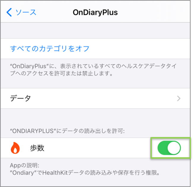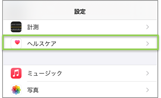 【ヘルスケア】を【ON】(緑色)に切替える