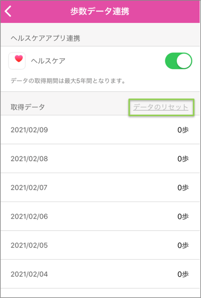データ連携後【データのリセット】を押すと登録された歩数データが削除される。リセット後は、再度連携設定をするか、手動での歩数の登録ができます。