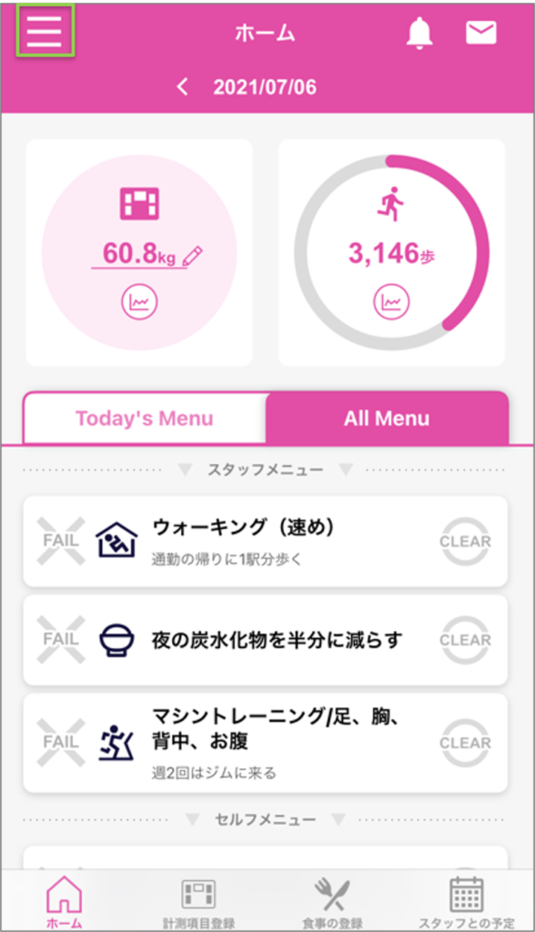 ⑤【トレーニングメニュー】スタッフが作成したトレーニングメニューが確認できます。