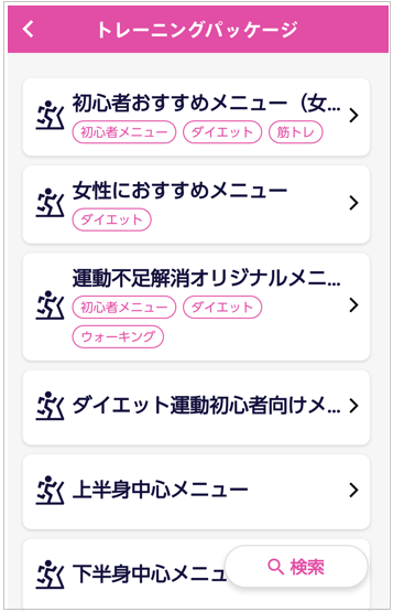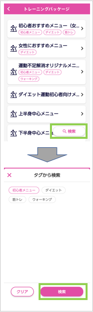 【検索】ボタンで、任意のタグがついたトレーニングメニューを検索することもできます