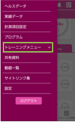 ①サイドメニューで【トレーニングメニュー】を選ぶ