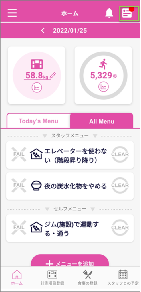 ②Diaryチャンネルに新規コメント(未確認のコメント)がある場合、ホーム画面の【Diaryチャンネルマーク】にバッチ(赤い丸)がつきます。