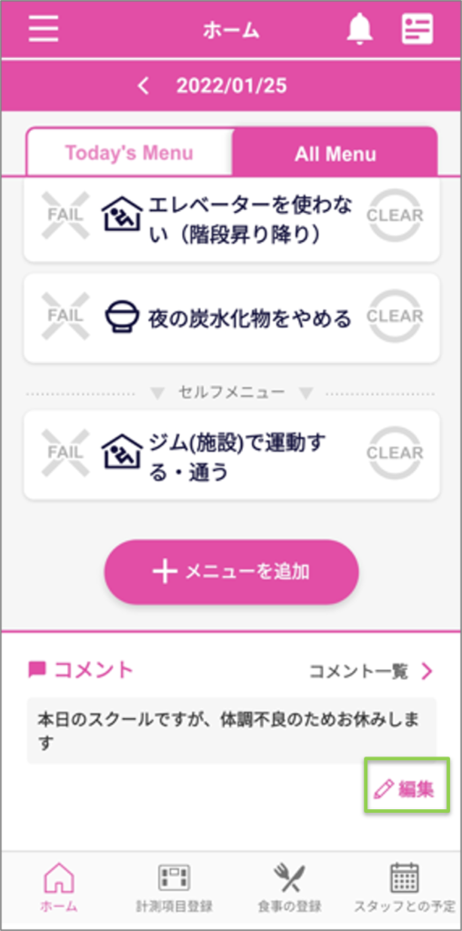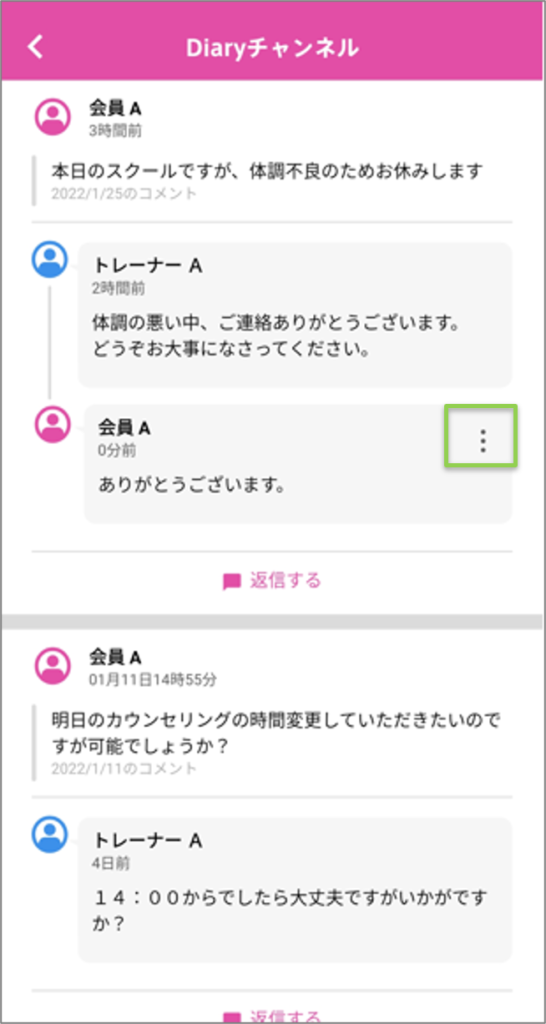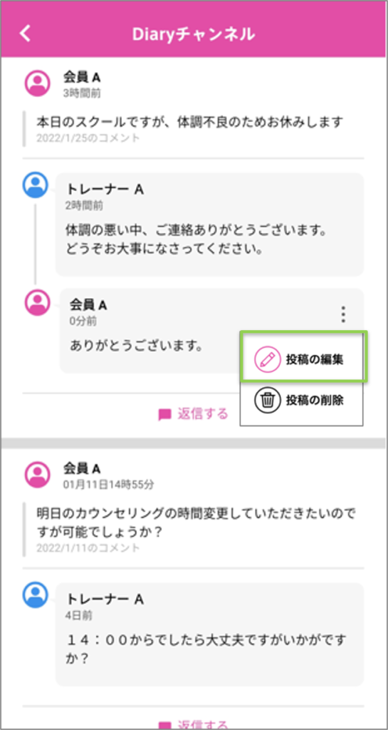コメント欄やDiaryチャンネルを使ってスタッフへ送ったコメントは、編集・削除することができます。