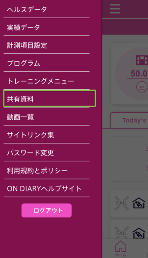 ①サイドメニューで【共有資料】を選ぶ