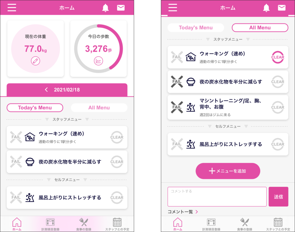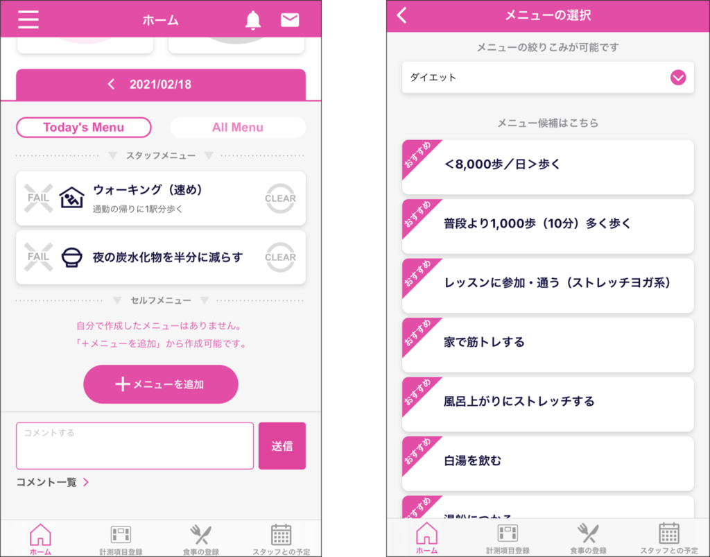 ホーム画面の<+メニュー追加>から自分で習慣メニューを作成することができます。