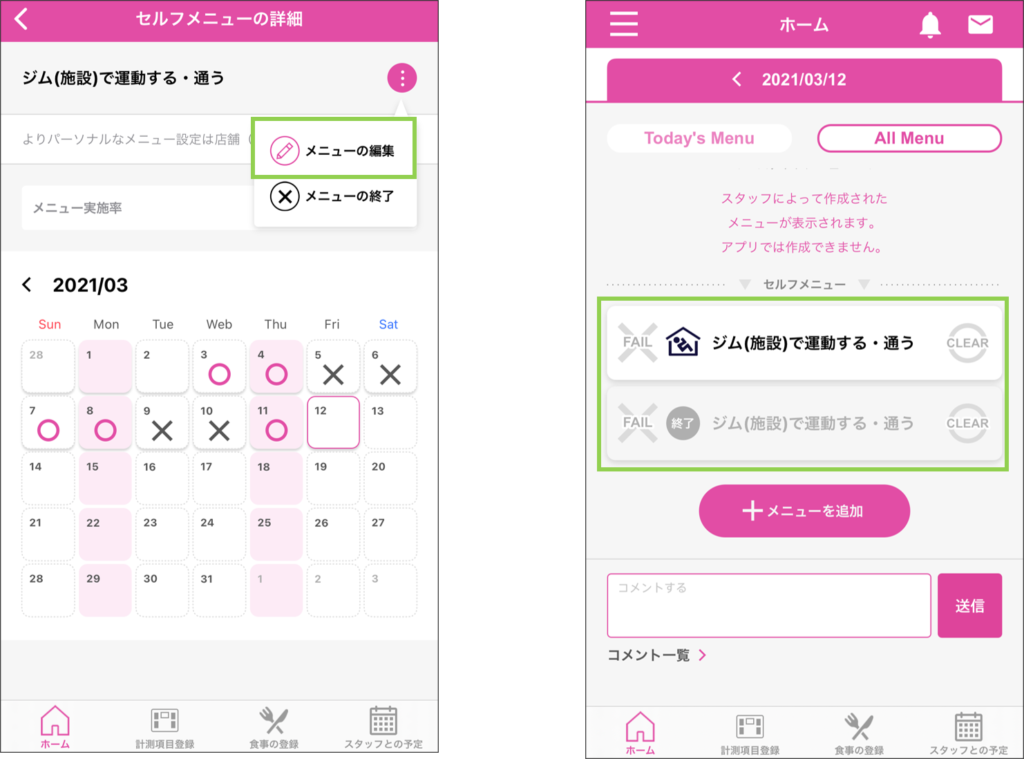 ・セルフメニューに「編集」が追加され、実施曜日と詳細を変更することができるようになります。